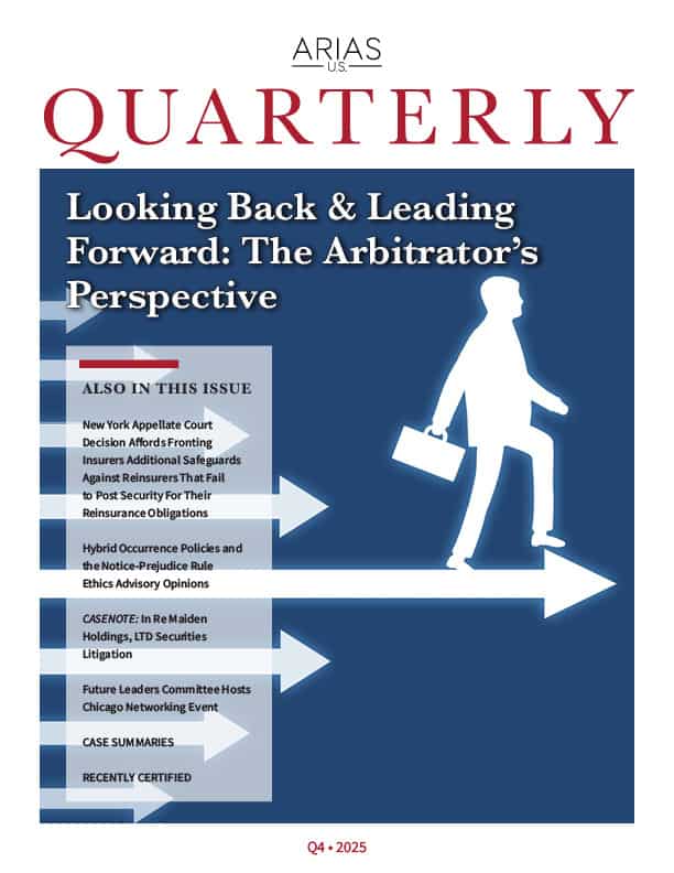 The ARIAS•U.S. Quarterly, published each quarter by the Society, includes articles that focus on procedural issues and activities directly relevant to insurance/reinsurance arbitration. It is mailed to all members with valid US postal addresses. Members with international mailing addresses must download the Quarterly in PDF form located on the right